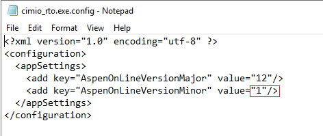 Navigate to C:\Program Files (x86)\AspenTech\CIM-IO\io\Cimio_rto and open the file named cimio_rto.exe.config. Change the AspenOnLineVersionMinor string from 0 to 1, save the file, then restart CIM-IO.